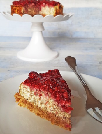 Torta z vločiek, tvarohu a malín. Do tejto zdravej torty boli pridané aj chia semiačka.