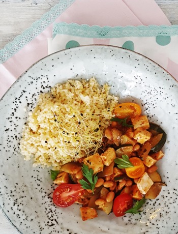 Výživné zeleninové kari s tofu. Pre zvýšenie výživovej hodnoty pridaný topinambur. Kari podávané s quinoou a šalátom.