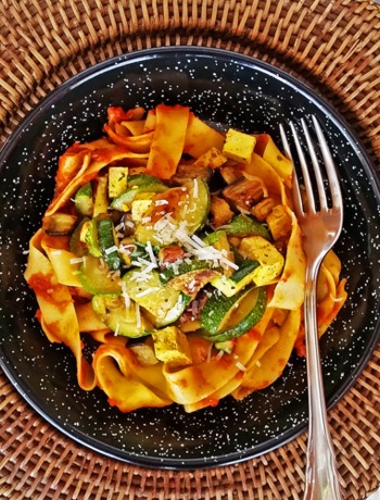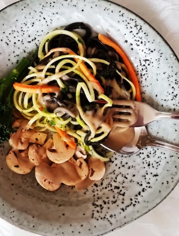 Vegánske špagety zo zeleniny s vegánskou hubovou omáčkou. Vynikajúca zdravá večera.