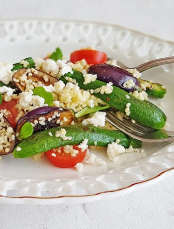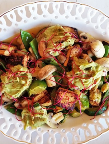 Teplý šalát z húb, cukety a tofu s krémovým avokádom. Chutná a zdravá večera.