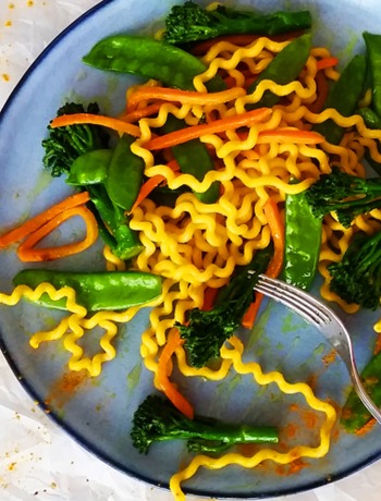 Špagety s kurkumou a chrumkavou zeleninou. Rýchle, zdravé a jednoduché vegánske jedlo pre každého.