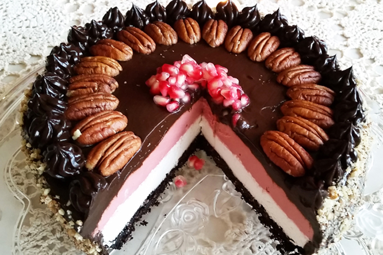 Táto torta spôsobí absolútny rozruch na Vašej oslave. Veľké finále na Vašom sviatočnom stole. Až gýčovo čokoládová farba so zlatistými pekanovými orechmi upúta pozornosť na prvý pohľad. Po rozkrojení a ochutnaní sa stanete kráľovnou oslavy!