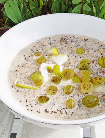 Čerstvé egreše perfektne zapadli do zdravej raňajkovej kaše. Orechy, vločky, amarant, jogurt a egreše vytvorili nebíčko v papuľke.